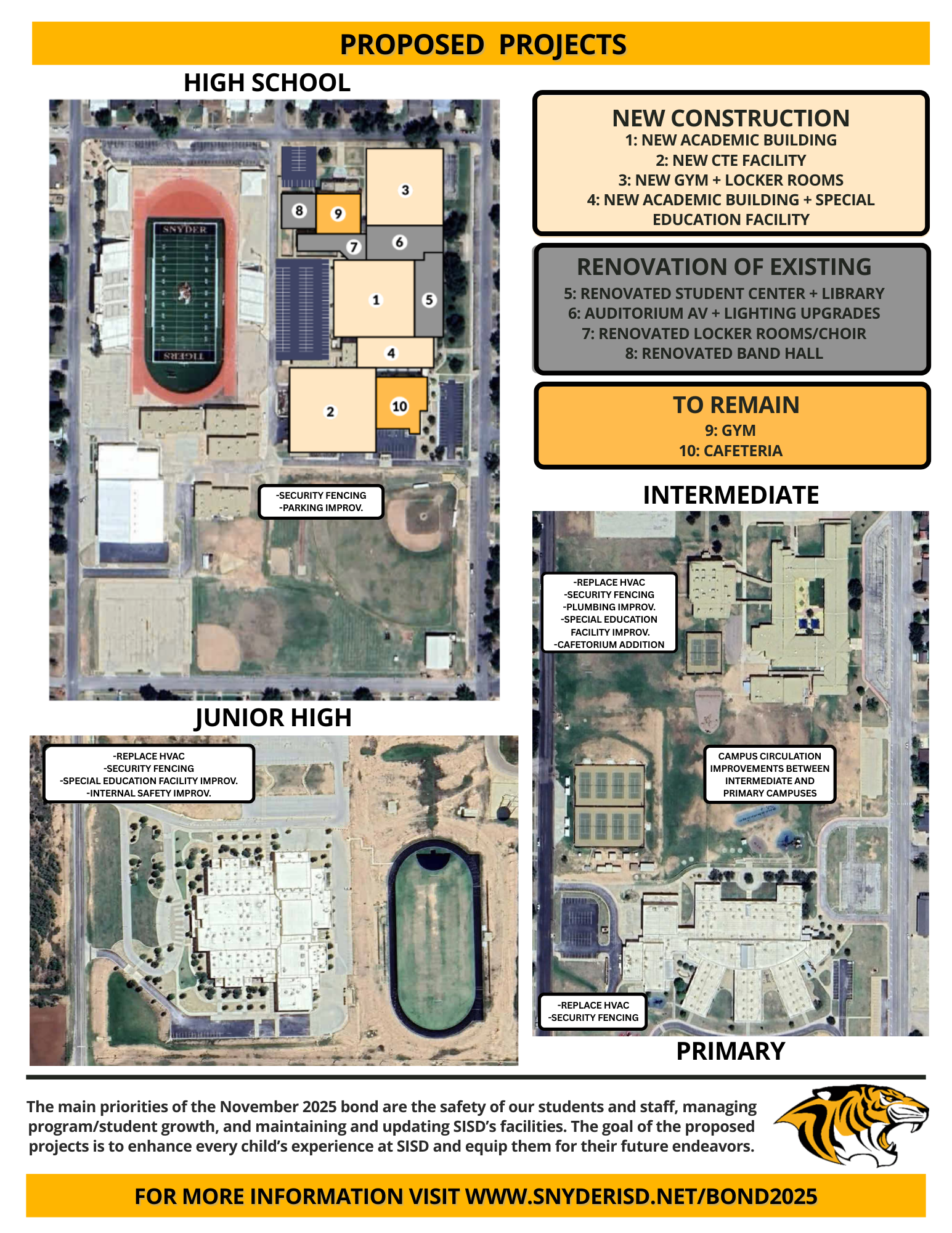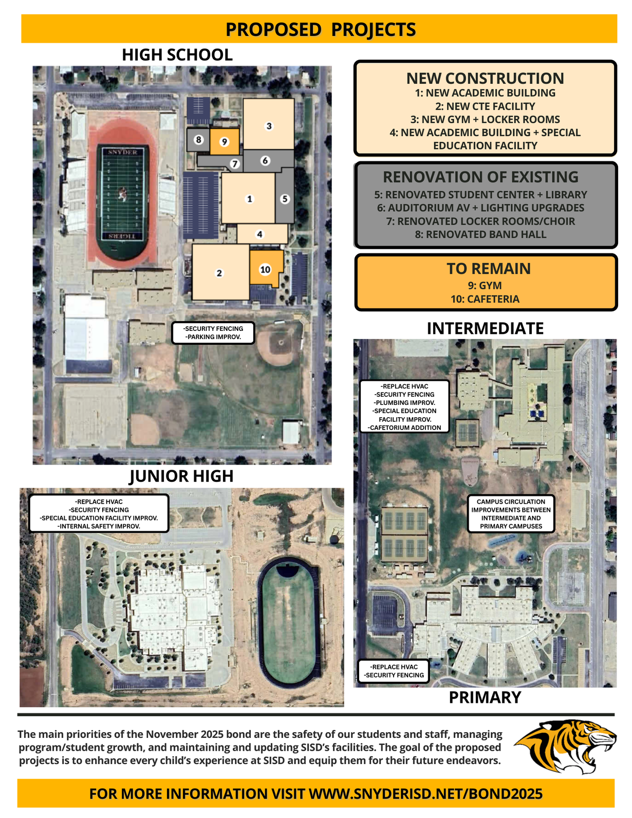 The main priorities of this bond are the safety of the students and staff, managing program/student growth, and maintaining and updating Snyder ISD facilities.